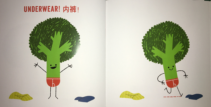 一群友善的蔬菜穿各种丰富多彩的内裤——有大大的、小小的、脏脏的、干净的、旧旧的、新新的、一本正经的、有趣的——展示了内裤的愚蠢和必要性。蔬菜穿着出乎意料外的内裤,笑料十足。但是这个“大孩子”得意地在前面炫耀时,胡萝卜宝宝穿着婴儿纸尿裤把所有读者都逗乐了。看起来十分美味的蔬菜插图,搭配活泼的故事能激励一些刚刚摆脱尿布的孩子。