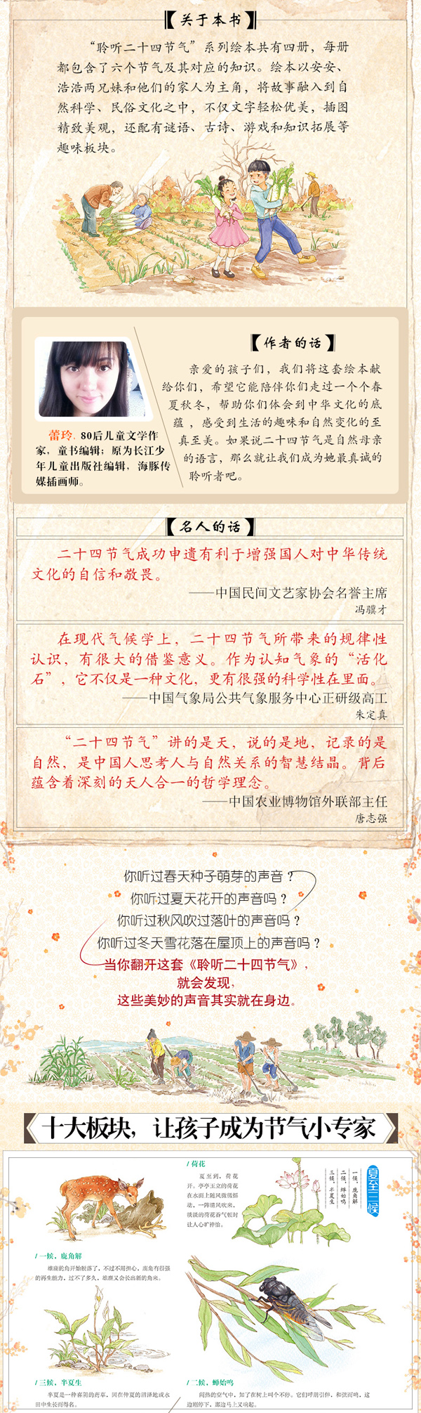 这套绘本把中国传统智慧和现代生活方式结合在一起,揭示了自然界的魅力和农业的趣味,我会很高兴地把这样的本土作者的自然绘本拿给我女儿阅读学习。