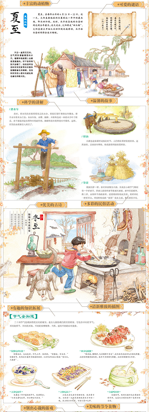 《这就是二十四节气》,用适合孩子阅读的图画书形式,把中国传统智慧和现代生活方式结合起来,揭示了自然界的魅力和农业的趣味。书中用精美的图画呈现出城市里孩子不常见到的农村生活劳动场景,唤起孩子心中至真至美的感受,同时启发孩子们知晓,无论生活如何变化,我们应该关注农业农村,关注纯粹的自然,关注我们衣食的初来源。