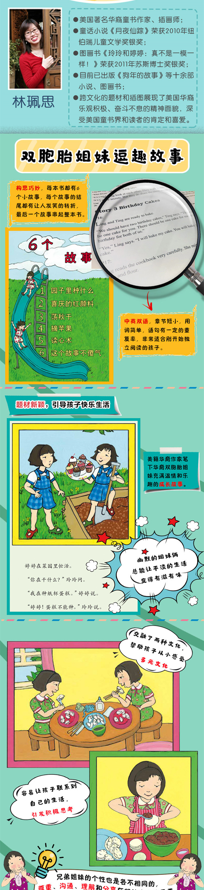 这是一本引进版图画书,讲述了一对双胞胎的成长故事,全书包含四个主题:真不是一模样、傻里又傻气、一起过生日、一年四季有你相伴。玲玲和婷婷长着一样的褐色眼睛、一样粉扑扑的脸蛋,总爱突发奇想,她们一起尝试了很多有意思的事。她们总是一起过生日;一年四季,不论什么天气,她们总是待在一起,一起住,一起玩,一起吃东西……她们甚至一起找到了“双胞胎彩虹”。全书内容亲切而又贴近生活,玲玲和婷婷的每一个生活小故事仿佛都发生在我们身边,却又充满无限趣味。