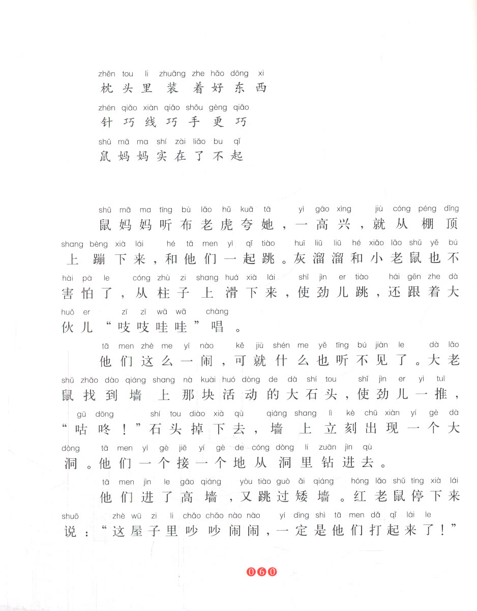 小老鼠就从黄靴子那儿往下打洞。他打好洞,自己先退出来,又用力去拉那只花脚。花脚动了一下,接着,有一个活东西钻出来。
