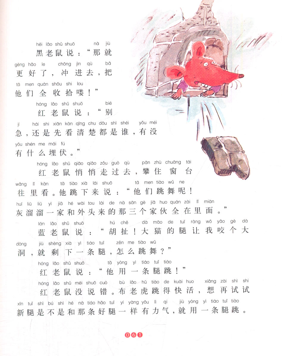 小老鼠一见这个活东西,吓得“吱”一声叫,转身就跑,拼命从大垃圾桶上跳下去了。