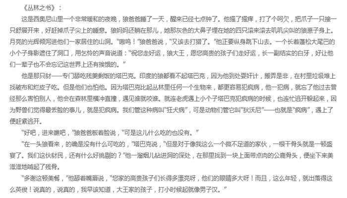 《丛林之书》中包括《丛林之书》中的7篇和《丛林之书续篇》中的3篇。主要是以少年莫格里为中心的人物故事。讲述了莫格里从婴儿到长大的经历,书中涉及了他的狼妈妈、狼兄弟、黑豹、老熊等性格鲜明的形象。《丛林之书》这些故事地域广阔,有印度的丛林,白令海的诺伐斯托希那赫,半年不见太阳的北极圈,喜马拉雅山的一个圣地等。所描写的动物有瞌睡朦胧的巴鲁,跛脚而一意孤行的老虎森林可汗,黑豹巴格希拉,西奥尼狼群的首领独狼阿克拉,岩蛇卡阿等。除了这些重要角色之外,还有大象、豺狗、海豹、眼镜蛇、鳄鱼、狗、麝鼠、獠、猴子、鸟等等。吉卜林都给它们起了名字,有的还有绰号。阅读《丛林之书》,能够让青少年读者培养对大自然的亲近与敬畏,在莫格里的成长故事中,收获勇气与责任心。