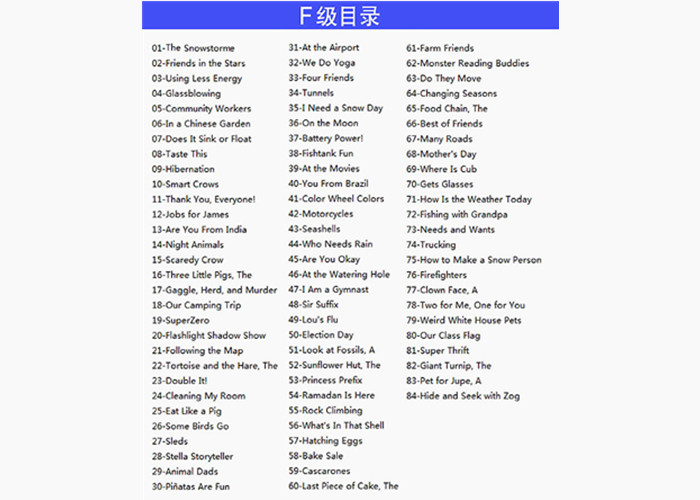 2、各大体系的英文分级读物各有各的优势,建议相互穿插,可以根据每个孩子不同的口味进行选择和调整,通过大量的阅读来建立孩子阅读的能力和知识扩充。家长千万不要为了“完成级别”而强行逼迫孩子读不喜欢的主题,尤其是学龄前,英语学习还是以兴趣为主。