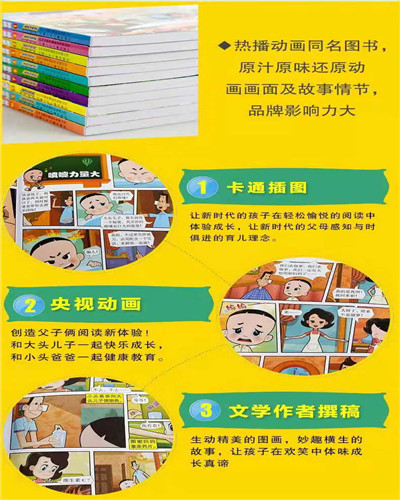 本套丛书是与当前央视热播的新版国产原创动画片《新大头儿子和小头爸爸》相配套的抓帧连环画,围绕故事主线选择抓帧截图,配以动画中的台词精工制作,保持动画的风格和连贯性,便于喜爱动画的儿童阅读和收藏。 主要讲述了一个大头大脑的可爱男孩和他的小头小脑的父亲以及圆胖身材的围裙妈妈组成的和睦家庭发生的有趣故事。