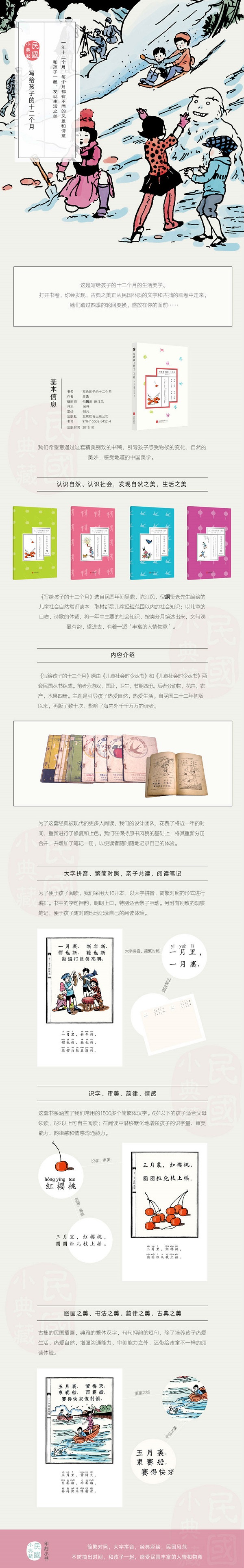 春耕、夏耘、秋收、冬藏。一年十二个月,每月都有不同的风景。本套书选自民国年间吴鼎、陈江风、倪?贤老先生编绘的儿童社会自然常识读本,取材都是儿童经验范围以内的社会知识;以儿童的口吻,诗歌的体裁,将一年中主要的社会知识,按类分月编述出来,文句浅显有韵,望进去,有着一派“丰富的人情物意”。我们希望意通过这套精美别致的小册子,引导孩子感受物候的变化,自然的美妙,感受地道的中国美学。