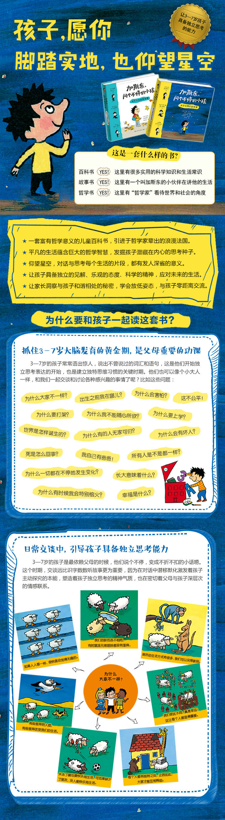 这是一本富有哲学意义的儿童百科书。亚里士多德说,哲学作为“爱智慧”产生于差异与好奇,这本关于世界的哲学课,不是一个个空洞的概念,而是一种“哲学式”的思索。讲述了一个叫加斯东的法国小男孩,他对兄弟姐妹为什么会吵架、为什么会有坏人、什么叫做信任、为什么有的人无家可归等等社会和人际关系方面的问题充满了疑问,在爸爸妈妈向他解释的同时,他获得了很多人生问题的感悟,也激发了他对自己和身边人和事的思考。这些问题并非一时兴起的胡思乱想,而是在加斯东每天的生活中出现的一个个具体的现象和事件,因为孩子的听、闻、嗅、触等所有感官都与外部的世界产生对应。如果你的孩子正处在3—7岁的年龄段里,细心的家长不妨回想一下,孩子是不是也有人际交往与处世哲学的困惑,他也会像个小大人一样和我们一起交谈和讨论这些有点琐碎但对他们的心情和成长至关重要的事情呢?这种交谈是比识字数数听故事更为重要,因为这种讨论在潜移默化中激发着孩子主动探究的本能,塑造着孩子独立思考的精神气质,也在密切着你与孩子深层次的情感联系。在这本书中,加斯东和妹妹丝朵在日常生活中,有兄妹彼此亲密的陪伴,也有两个人偶尔的不愉快,在处理两个孩子之间的问题时,书中的爸爸妈妈做出了智慧的沟通。总之,我们想告诉孩子关于生死、幸福、公平、正义、善恶、好坏、美丑、爱与被爱等等这些也许没有终ji答案的哲学命题,都融化在了小加斯东的平凡生活中,以对答的形式传达给了阅读这部书的孩子和所有爸爸妈妈们。当然,我们更希望通过这部书,让家长习惯和孩子平等相处的姿态,认识到孩子不是我们身体与眼界的缩小版,我们也不是孩子的未来成长的模板,他们完全可以具备独立的见解、乐观的态度、科学的精神来应对未来生活中的一切。