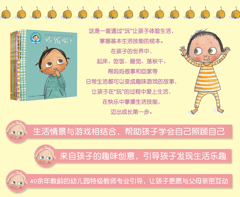 这是一套通过“玩”让孩子体验生活,掌握基本生活技能的绘本。全书共6册,图书从0-3岁孩子视角和心理特点出发,讲述了6个孩子如何把生活中起床、吃饭、睡觉、荡秋千、帮妈妈做事和回家等日常事物变成趣味游戏的故事,展现了孩子无穷无尽创新能力,让孩子在“玩”的过程中爱上生活,在快乐中掌握生活技能,迈出成长第一步。
