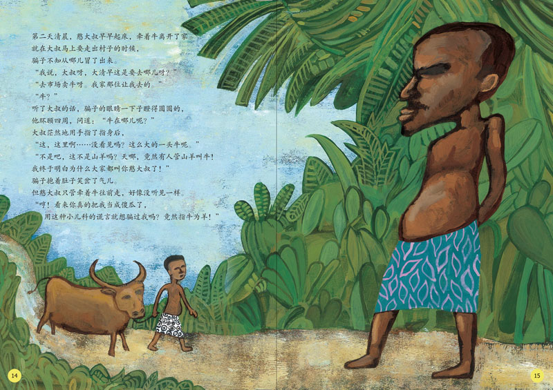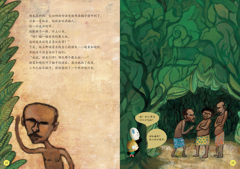 这是来自印度尼西亚的童话故事,本书的插画运用丙烯颜料绘制而成,画面层次丰富而明朗,颜色饱满、浓重、鲜润,且富有光泽。不管是人物形象、服饰,还是自然环境,都很好地体现出印度尼西亚的特色。