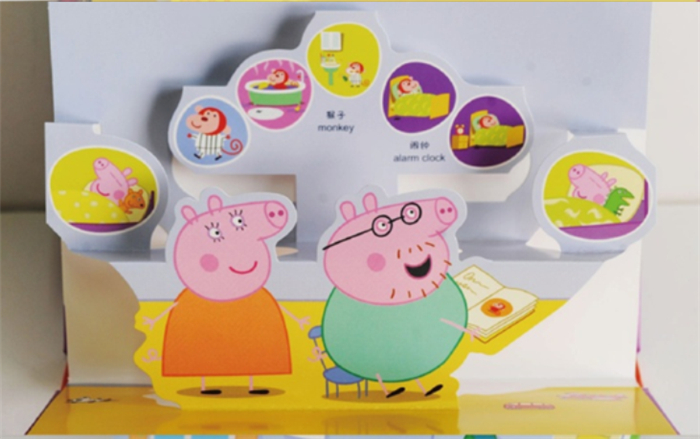 这是一套根据英国知名动画《小猪佩奇》进行改编的3D立体剧场故事书,打开即可看到生动有趣的3D立体剧场演绎,让孩子产生身临其境的感觉。另添加弹跳、翻翻、转盘、滑动、推拉等多种机关设置,小手推动箭头,猪爸爸做起了俯卧撑;打开翻翻页,佩奇脸上的红疹变少了;转动转盘,牙仙子给睡梦中的佩奇带来了金币;不同的场景瞬间变幻,就像看动画片。