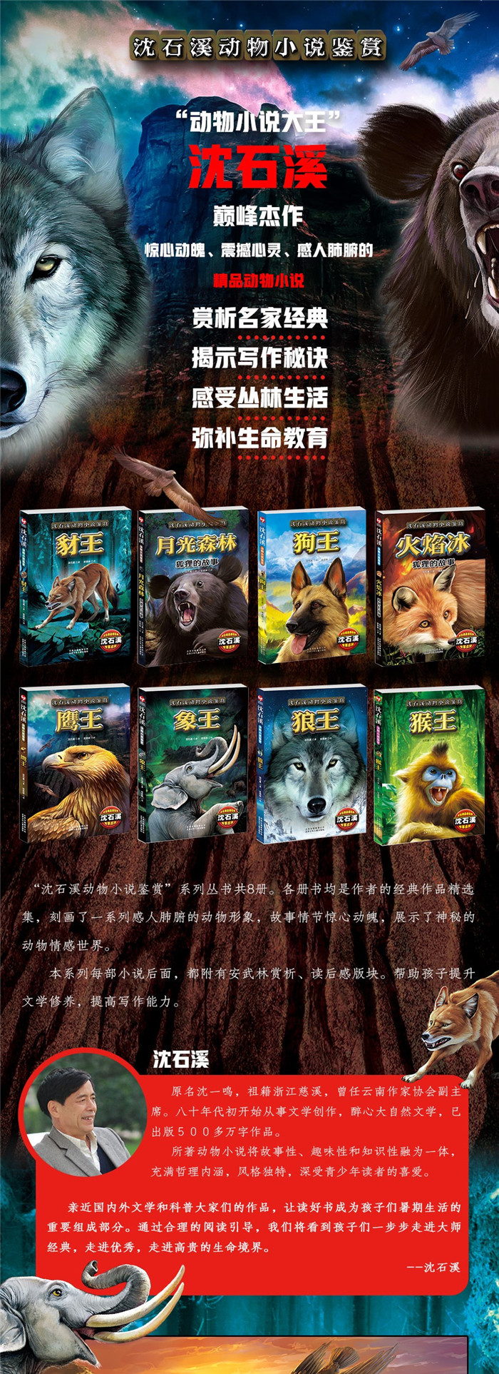 各册书均是作者的经典作品精选集,刻画了一系列感人肺腑的动物形象,故事情节惊心动魄,展示了神秘的动物情感世界。在《狼王》《鹰王》《象王》《豺王》四本书中,均精选了沈石溪6部中短篇小说。每部小说后面,都附有安武林赏析、读后感版块。通过这两个版块的设置,读者将深入了解作品的写作风格、写作技巧及主要特点,由此提高自己写作水平,并高效评价和鉴赏文学作品。在“读后感”版块中,收录了中小学生对各篇作品的读后感,既能拉近图书与小读者的距离,又能帮助小读者深入地了解作品,提高写作水平。