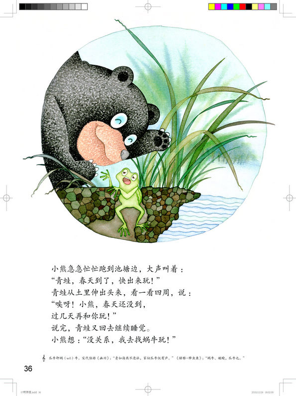 为了兼顾各年龄层,文字有大小、深浅之分,图画也有大小的差别;但是彼此间会有自然的连贯。幼儿是从图像中学习到文字的具体意义,而并非借由抽象的汉语拼音字母。因此,我们有意未强调汉语拼音和认字,而是在潜移默化中影响孩子,引导孩子学习。