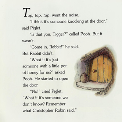Christopher Robin teaches Pooh rules for staying safe, especially not talking to strangers, which come in handy when there is an unexpected knock at Pooh's door