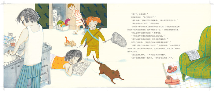 这是关于一个大人和孩子互换角色的故事。调皮的小儿子突然在一天早上说自己不想去上幼儿园,爸爸提了一个好主意:那么孩子和爸爸妈妈交换角色。孩子们去上班,爸爸妈妈去上学。这样的角色交换后不仅仅让孩子们体验到了作为大人应该付出的责任,爸爸妈妈也体验到了回到童年的快乐,也了解到孩子们现在*