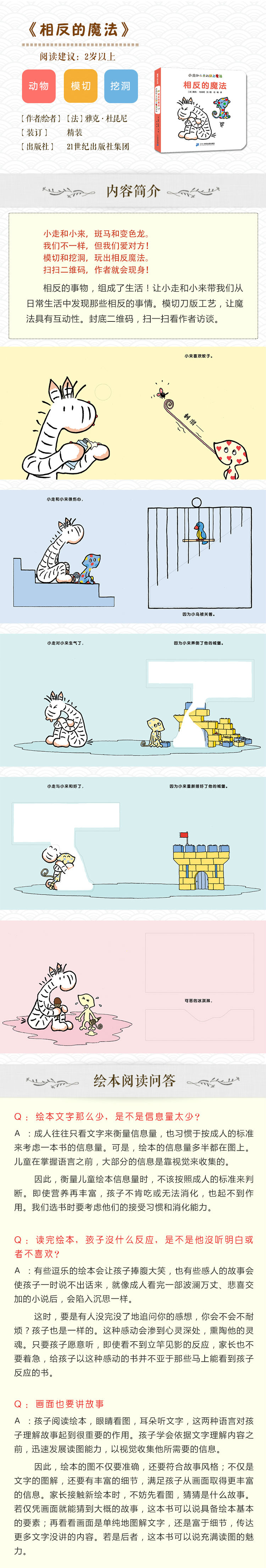 相反的事物,组成了生活!让小走和小来带我们从日常生活中发现那些相反的事情。模切刀版工艺,让魔法具有互动性。封底二维码,扫一扫看作者访谈。
