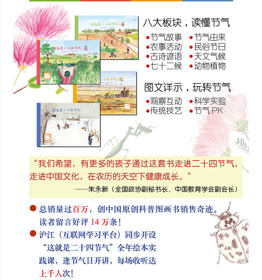 二十四节气是中国农民数千年的智慧之果,学会用它来观察和体味世界,把自己融入太阳引领的大自然变化节律中,中国的孩子们会更加热爱生活,敬畏生命,升华自己的精神世界。