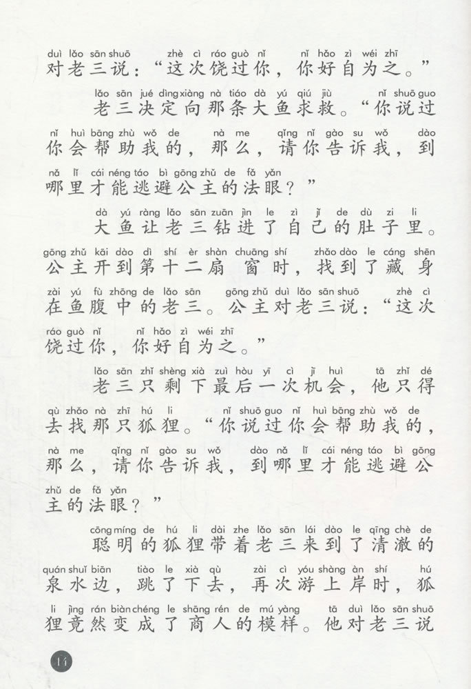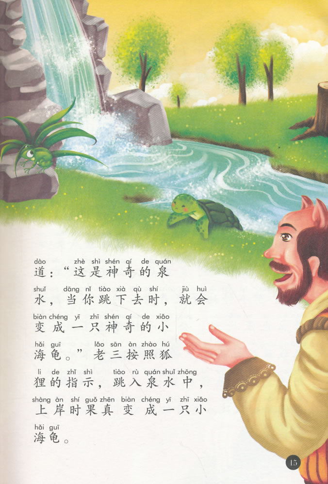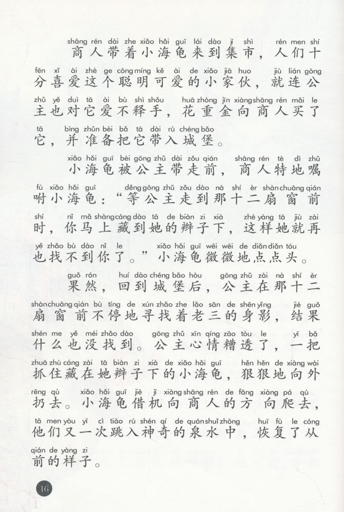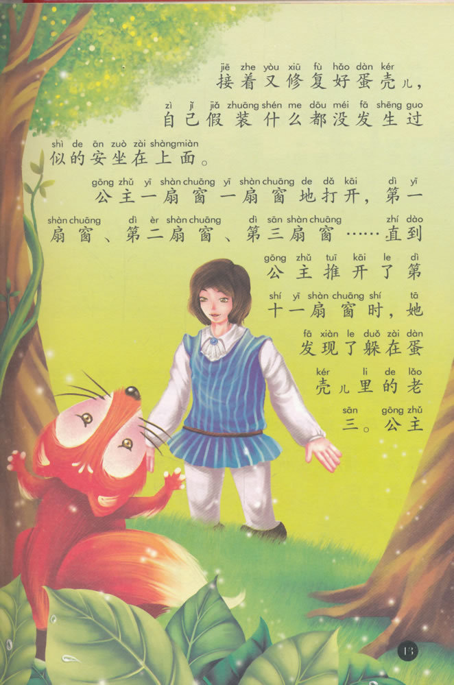 火眼金睛的公主十二扇神奇的窗户很久以前,有一个国王带着自己美丽的女儿住在金光 闪 闪的城堡里,过着富足的生活。国王一直希望 公主能够在他有生之年,找到一个适合她的丈夫。可是傲慢的公主却希望自己能够一个人自由地生活在美丽的城堡里,不愿意结婚。公主居住的城堡里有十二扇向外开启的窗户,她每天最喜欢做的事情就是对着窗户向外望。每当这时,整个王国都在她的眼底,仿佛这世间没有任何事物能够逃得过她的火眼金睛。一天,公主写好告示,命侍卫贴在城门口:“如果你想成为公主的丈夫,要么,你便躲起来让公主找不到;要么,就将你的命留下。”公主自认为没人能够逃得过她的法眼。告示贴出去以后,有许多人慕名而来,但都没能逃过公主的眼睛,他们都因此丢了性命。城外又来了三个兄弟,他们三人都要向 公主求婚。老大钻进黑漆漆的石灰窑,公主站在城堡的第一扇窗前,马上看到了他,于是,他被杀掉了。老二爬进暗无天日的地窖,公主开启第五扇窗时,看见了他,他也被杀掉了。看到两个哥哥丢掉了性命,老三有些胆战心惊,于是请求公主能够给他三次机会。傲慢的公主认为即使给他再多的机会,他仍然逃不过城堡的十二扇窗户,便答应了他的请求。老三钻进茂密的森林里,想着怎样才能让公主看不见自己。突然,他看到一只正在奋力挥动翅膀的乌鸦,他举起携带的枪支,准备瞄准。乌鸦开口向他祈求道:“别开枪,以后你遇到什么麻烦,我会帮助你的。”老三便放下了手 中的枪。他又向前走,来到一个湖边,看到一条从水中腾空跃起的大鱼,老三举起了枪对准大鱼。大鱼叫道:“别杀我,我会用我的生命报答你。”老三又一次放下手 中的枪,继续向 前走。他遇到一只跛脚的狐狸,于是他再一次举起了枪。“别杀我,我会感激你一辈子的。”受伤的狐狸呻吟着,老三又一次心软了。狐狸的计谋直到太阳 升起,老三才再次踏上躲避公主的旅途。可是他不知道哪里才能 真正逃避公主的法眼。这时,老三想到了那只他放过的乌鸦。“你说过你会帮助我的,那么,请你告诉我,到哪里才能逃避公主的法眼?”老三诚恳地问乌鸦。乌鸦想了好一会儿,告诉他一个好主意。然后,乌鸦立即从自己的鸟窝中掏出了蛋,并将它打碎,把老三装了进去,接着又修复好蛋壳儿,自己假装什么都没发生过似的安坐在上面。公主一扇窗一扇窗地打开,第一扇窗、第二扇窗、第三扇窗??直到公主推开了第十一扇 窗时,她发现了躲在蛋壳儿里的老三。公主对老三说:“这次饶过你,你好自为之。”老三决定向那条大鱼求救。“你说过你会帮助我的,那么,请你告诉我,到哪里才能逃避公主的法眼?”大鱼让老三钻进了自己的肚子里。公主开到第十二扇 窗时,找到了藏 身在鱼腹中的老三。公主对老三说:“这次饶过你,你好自为之。”老三只剩下最后一次机会,他只得去找那只狐狸。“你说过你会帮助我的,那么,请你告诉我,到哪里才能逃避公主的法眼?”聪明的狐狸带着老三来到了清澈的泉水边,跳了下去,再次游上岸时,狐狸竟然变成了商人的模样。他对老三说道:“这是神奇的泉水,当你跳下去时,就会变成一只神奇的小海龟。”老三按照狐狸的指示,跳入泉水中,上岸时果真 变 成一只小海龟。商人带着小海龟来到集市,人们十分喜爱这个聪明可爱的小家伙,就连公主也对它爱不释手,花重金向商人买了它,并 准备把它带入城堡。小海龟被公主带走前,商人特地嘱咐小海龟:“等公主走到那十二扇窗前时,你马上藏到她的辫子下,这样她就再也找不到你了。”小海龟微微地点点头。果然,回到城堡后,公主在那十二扇窗前不停地寻找着老三的身影,结果什么也没找到。公主心情糟透了,一把抓住藏在她辫子下的小海龟,狠狠地向外扔去。小海龟借机向商人的方向爬去,他们又一次跳入神奇的泉水中,恢复了从前的样子。老三昂首挺胸走进了城堡里,公主不得不面对现实。后来,这位年轻人成为国王,而公主却一直不知道,老三第三次究竟躲在哪里。