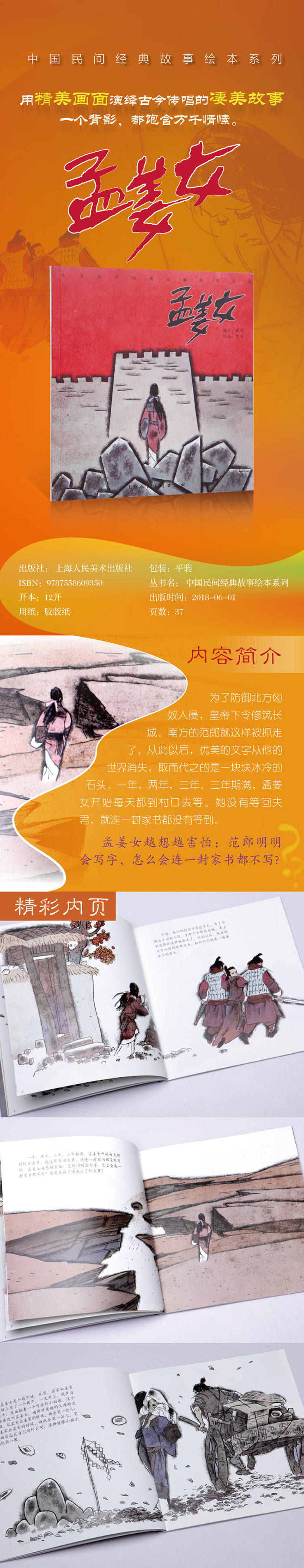 相传秦始皇时,劳役繁重,青年男女范喜良、孟姜女新婚三天,新郎就被迫出发修筑长城,不久因饥寒劳累而死,尸骨被埋在长城墙下。孟姜女身背寒衣,历尽艰辛,万里寻夫来到长城边,得到的却是丈夫的噩耗。她痛哭在城下,三日三夜不止,城为之崩裂,露出范喜良尸骸,孟姜女于绝望之中投海而死。