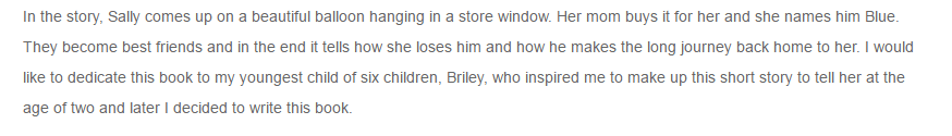 In the story, Sally comes up on a beautiful balloon hanging in a store window. Her mom buys it for her and she names him Blue. They become best friends and in the end it tells how she loses him and how he makes the long journey back home to her. I would like to dedicate this book to my youngest child of six children, Briley, who inspired me to make up this short story to tell her at the age of two and later I decided to write this book.