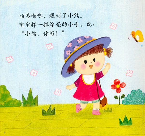 由郑熙溶所*的《宝宝去散步》讲述:宝宝要去 散步,要像妈妈一样带着帽子,像姐姐一样背着包。散步途中遇到了熊猫,挥一挥漂亮的手和熊猫打招呼 ;散步途中遇到了山羊爷爷,把手放在肚脐上和山羊 爷爷打招呼;散步途中,和兔子相撞,吹一吹兔子的 头,和兔子道歉;散步途中,还得吃零食,和大家一 起吃,觉得*好吃。宝宝,现在该睡觉了。大家晚安 。下次再见,拜拜。