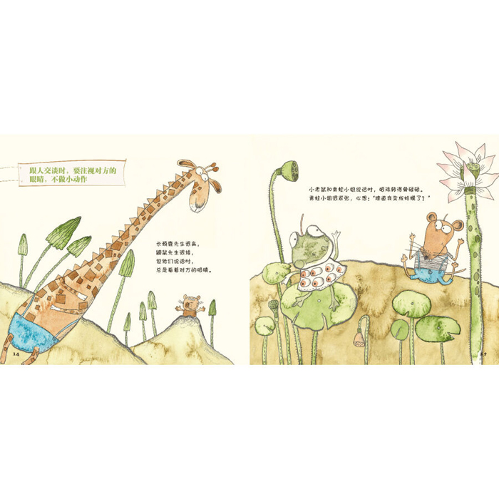 首先,内容全面,涉及孩子日常生活的方方面面都基本提到了;其次,画面很幽默,特别好玩,不是那种枯燥的教条,每个礼仪点以一幅幅有趣的画面来讲述,以孩子能理解的方式来讲述,比如关于坐姿问题,长颈鹿因为没有坐直,结果你猜怎么着,小鼹鼠们把他当成了滑滑梯,在上面滚来滚去……