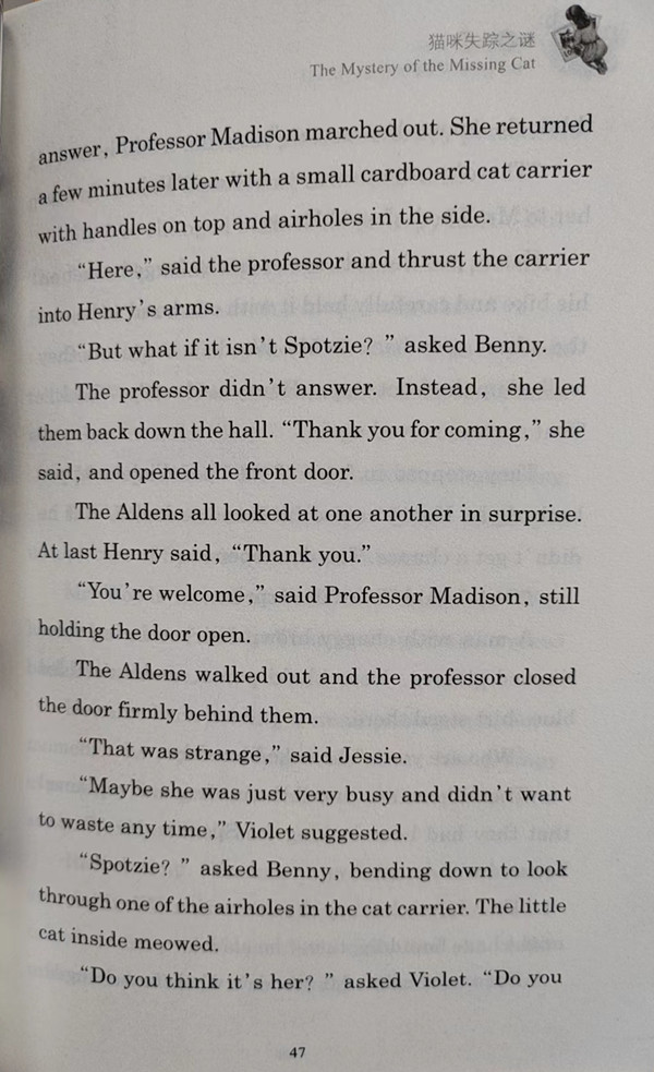 While investigating the disappearance of Spotzie, Mr. Woods'sbeloved cat, the Alden children discover that they are beingfollowed by a strange man, receive threatening phone calls, anduncover a number of mysterious suspects in the catnapping.Simultaneous.