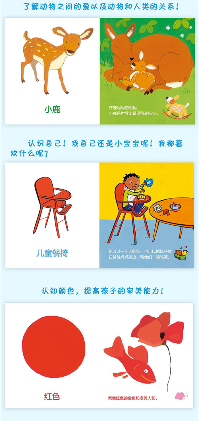 家庭必备启发孩子智力、培养孩子想象力、提高孩子表达能力的书。海绵衬垫的柔软封面,圆角模切的卡纸内文,环保绿色印刷,给小宝宝安全温柔的阅读体验。