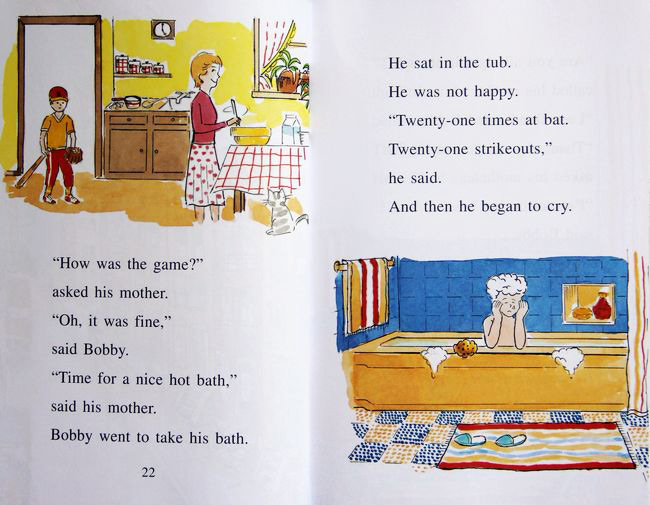 有一天Bobby最好的朋友借给他自己的幸运棒球棍,希望带给Bobby好运;但是轮到他上场时,依然还是被三振出局。 Bobby很沮丧地独自一人走回家,进家门时妈妈正在煮晚餐,于是他赶紧闪进浴室,以放洗澡水做掩护哭了起来。妈妈当然还是发现了,并关心的问到︰“Are you all right in there?”(你在里面还好吗?)“我总是被三振出局,没有同学希望我在他们那一队,甚至宁愿先选年纪比我小的孩子。”“They always choose me last.”(他们总是到最后才选我。)