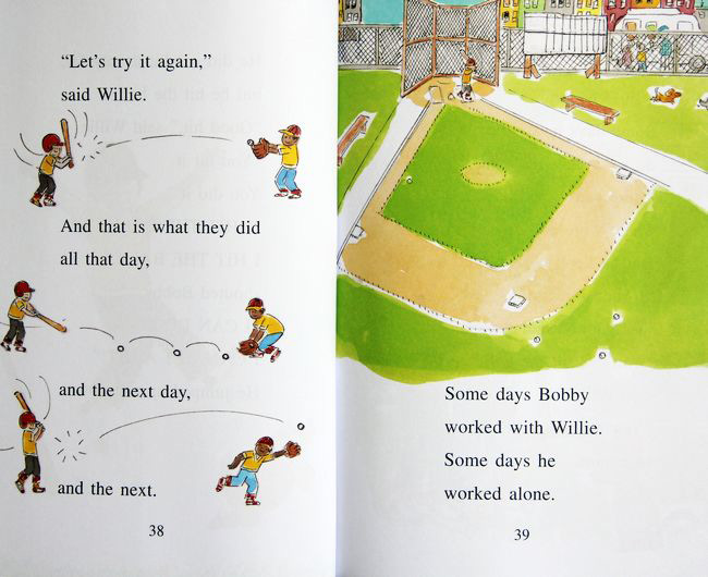 Bobby果然跟好朋友练习了起来。站稳、挥棒、再挥棒——终于,“He hit the ball!”(他打到球了!)