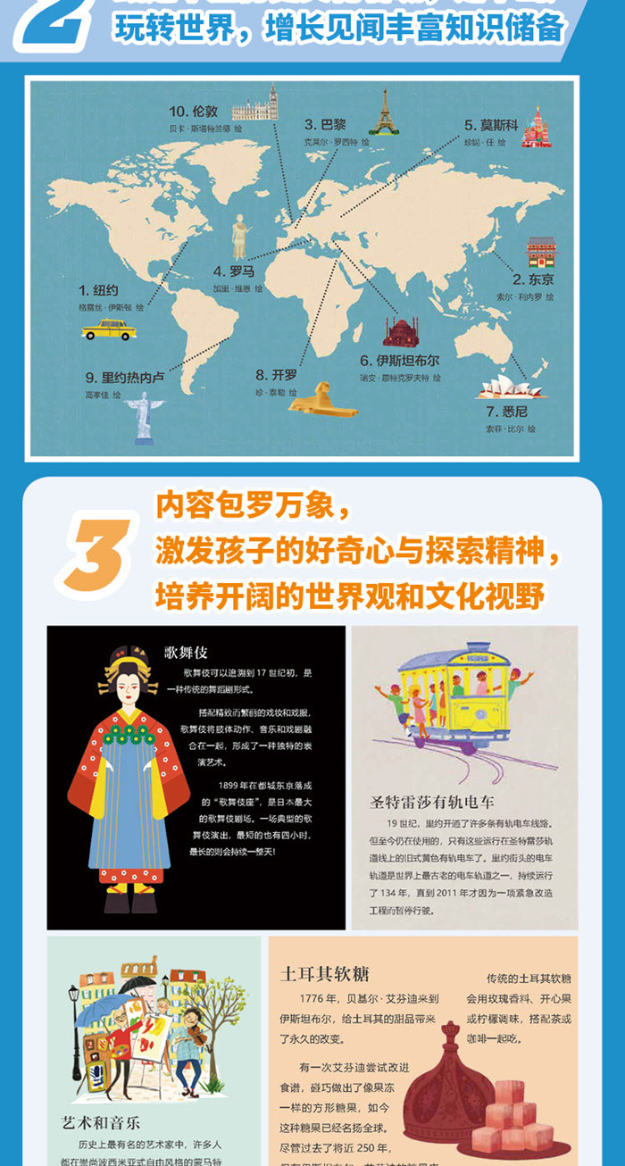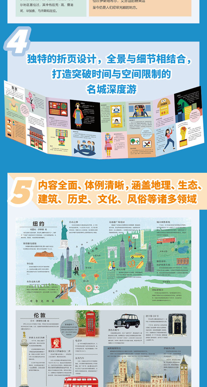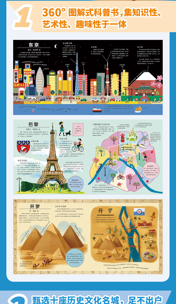 引进自企鹅兰登集团旗下小老虎出版社,英国畅销儿童科普360°系列新作。 ·融合先进的STEAM教育和通识教育理念,集知识性、艺术性、趣味性于一体。 ·甄选十座历史文化名城,足不出户也能玩转世界,增长见闻丰富孩子的知识储备。 ·精选地理、生态、建筑、历史、文化、风俗等方面的知识点,激发孩子对世界的好奇心与探索精神,培养开阔、包容的世界观和文化视野。 ·独特的折页设计,全景与细节相结合,既有壮阔的城市景观全貌,也有信息详实的图注与词条,将阅读变成穿越古今、游走街头、品鉴美食、体验当地生活、触摸文化历史脉络的名城深度游。 ·邀请10位不同国家的插画家贡献插图,在知识科普的同时展示前沿的童书绘画与设计理念,细腻的手绘画风、柔美典雅的配色,潜移默化地熏陶儿童的艺术审美能力。