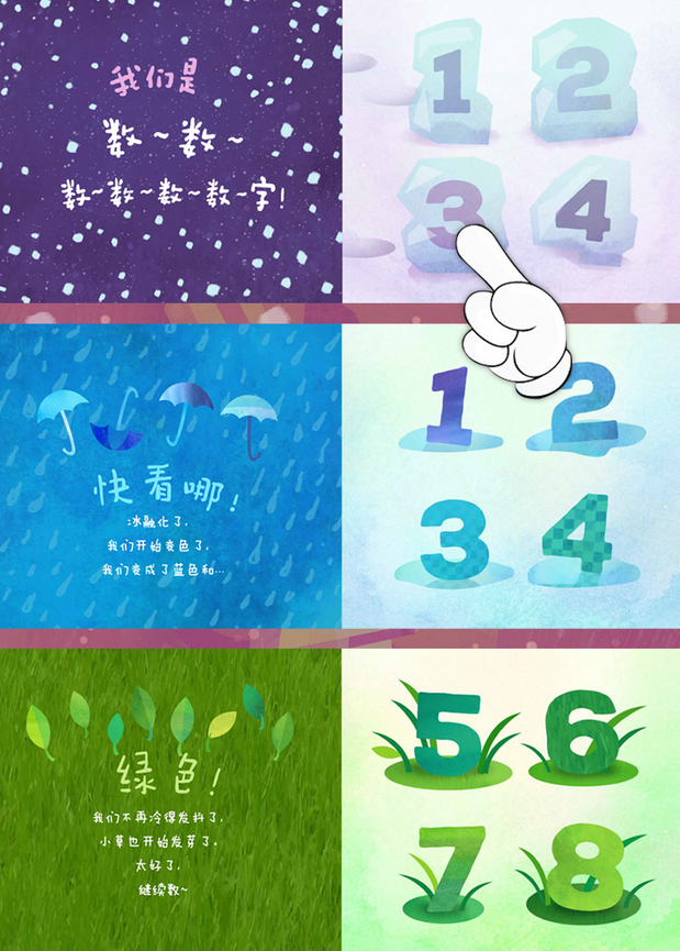 数字冻住了!需要有人来数数才能解冻,时间才会继续往前走。在阅读过程中,小读者变身小勇士,当他们按照书中的指示行动时,数字星球的居民们才能一个个解冻现身。 在数数的过程中,小读者们在书中同时感受到了温度的变化所引起的色彩和四季的变化。