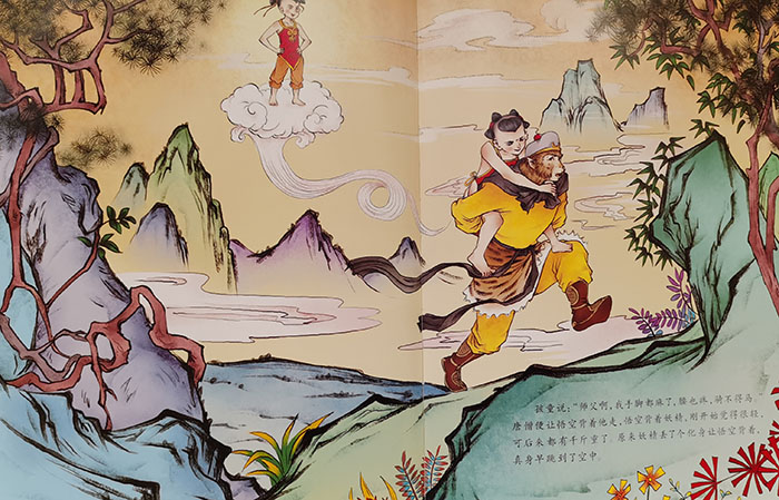 唐僧师徒四人大概走了有半个月, 忽见前方有一座高山挡住去路。师徒四人正走着, 忽然听到有人大喊: “救命啊! 救命啊! ”只见一个孩子被吊在了树上……