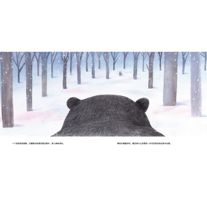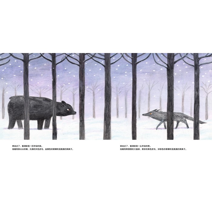 熊和狼这两种血性动物,似乎永远也不可能成为伙伴。然而,在一个飘雪的冬日傍晚,他们在森林里相遇,并在寒冷的冬日里结伴同行。森林里极致的安静,让两个伙伴看到了自然万物不同于往日的美。他们看到了雪花不同的形状,听到了飘雪落在皮毛上发出的细微声响,闻到了树皮湿润的气味……天色越来越晚,到了该说再见的时候了。熊回到洞穴中冬眠,狼跟随族群去追寻猎物。直到春天来临,他们再次相见……