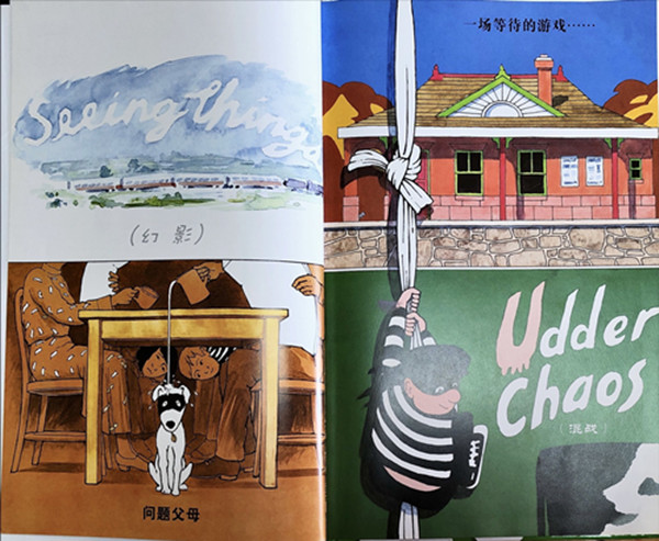 这本书开始自一个警告:“这本书似乎包含很多故事,它不会发生在同一个时期。”然后你根据它的提示细心去读。它可能包含更多的故事,或者它可能是四个故事又或者只是一个故事,还有可能是一个故事的四个部分。“仔细检查文字和图片是被推荐的阅读本书的方法。”你会成为这个故事的侦探,就像有人试图侦破一个犯罪的事实。每页分成四个故事,每个故事都占据四分之一的位置。它们位于相同的相对位置,这样你就可以根据故事的位置寻找线索。每个故事都有自己的标题。“看到事物”讲述的是一个男孩乘坐他的*班火车独自前行的故事。经过长时间的旅途,他来到了一个大的站台,看见了等待着迎接他的父母。他的母亲很同情他的艰苦旅程。“问题父母”讲述的是勤劳工作的父母下班回家穿着用报纸做的衣服,很快孩子们也穿上了这样的衣服。“一个等待的游戏”讲述的是一群成年人在火车站台等车的故事。随着等车时间久了,他们把无聊变得有趣起来了......