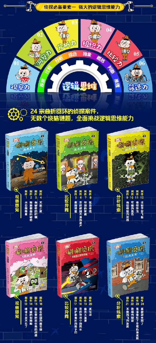 本系列图书通过唰唰侦探解决神秘事件的故事,引导孩子进行逻辑思考练习,帮助孩子打造思考框架,形成逻辑思维能力。适合小学低年级年龄段孩子阅读和使用。唰唰侦探是一位平时性格散漫、粗心大意,有些无厘头,但在关键时刻特别优秀的侦探。他很有正义感,喜欢帮助陷入困境的人。当他解不出案子的时候,拿出携带的牙刷和牙膏一刷牙,就能想出破案的好办法。每册图书以故事的形式展开,主人公唰唰侦探遇见了离奇的事件,然后与外星人阿尔法机器人一起,在机器人的帮助下,一起分析案件,抽丝剥茧,最后侦破案件,找到凶手。整套丛书共6册,每册除了呈现主体故事情节之外,注意从培养逻辑思维能力的某一方面的内容出发,锻炼孩子该方面的能力,比如观察能力、分辨能力、分析能力、概括能力、判断能力、推理能力,等等。书中将故事与知识完美融合,并增加了大量互动性板块,既能调动孩子的阅读自主性,还能在阅读过程中帮助孩子养成良好的逻辑推理思考能力,是一套集趣味性和功能性于一体的桥梁书。