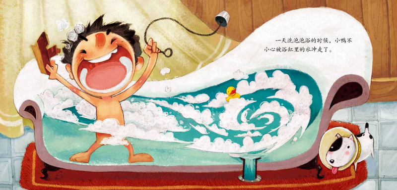 一天洗泡泡浴的时候,小鸭不小心被浴缸里的水冲走了。