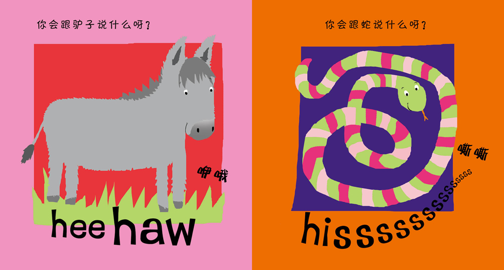 我们是在图书馆听故事时发现这本书的。我两岁的女儿从图书馆员的手里取过这本书,就再没有放下过。她喜欢动物的叫声。我的孩子把这本书‘读’给大家听,每个人都加入进来,发出动物的叫声。最有趣的是,结尾突然一转,所有孩子都发疯地大笑起来。这本书可以用来教小宝宝动物的叫声,又可以拿来给我刚学习阅读的孩子练习朗读,绝对值得收入!”