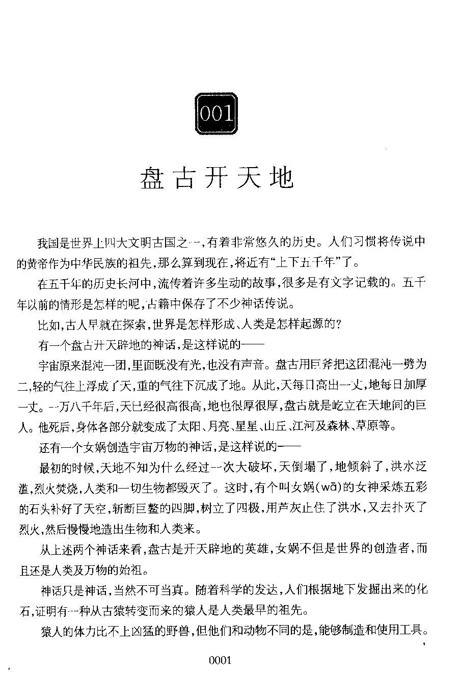 宇宙原来混沌一团,里面既没有光,也没有声音。盘古用巨斧把这团混沌一劈为二,轻的气往上浮成了天,重的气往下沉成了地。从此,天每日高出一丈,地每日加厚一丈。一万八千年后,天已经很高很高,地也很厚很厚,盘古就是屹立在天地间的巨人。他死后,身体各部分就变成了太阳、月亮、星星、山丘、江河及森林、草原等。