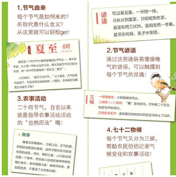 《我们的节气》是一本画给孩子的充满色彩与季节感的节气书。书中详细解读了一年二十个节气,带领着小朋友们在季节的变迁中,感受二十四节气中蕴含的深厚文化底蕴和人文情感。每个节气都包含节气由来、节气物候、节气谚语、传统民俗、节气诗词、农事活动等多个板块内容,并设置了与小朋友们的互动专题,令节气不再只是一首遥远的歌谣,而是真正融入孩子们的日常生活中。让我们打开这本书,与节气同行吧!