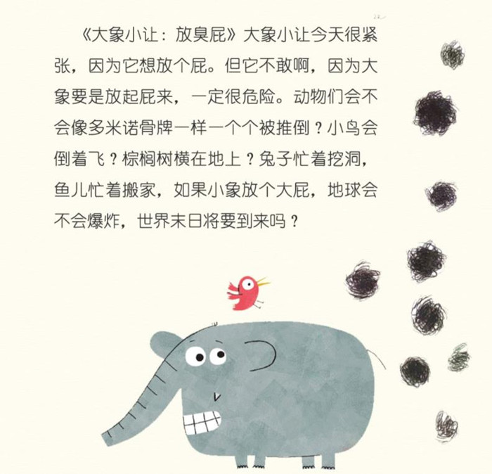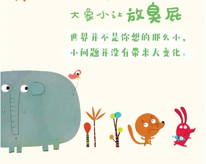 《大象小让》系列(全3册),共分为三册分别为《粑粑》《臭屁》《爱情菌》,适合2-6岁的小朋友阅读,告诉小朋友正确认识自己的情绪和生理现象。三本书分别从2-6岁小朋友最感兴趣的事情说起:大象拉了个小粑粑,大象憋不住臭屁以及藏在大象心中的爱情菌这三个角度,从小动物可爱的表现幽默的说出了小朋友心中的小情绪以及如何正确认识自己的生理现象。