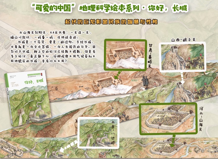 长城是一个符号,更是一种信仰。手绘长城,本身就是一次文化苦旅,一次人生阅历的升华。因为对于长城,爬上它的好汉已经数不胜数。但是有多少好汉,真正静下心,仔细观摩不同气候带和不同地貌区的长城,各有什么不同?没有历史文献考证,孩子们一定会问,这些都是残垣断壁,当初的辉煌呢?只有我们,在帮助您回忆,甚至是帮您重构历史的瓦砾,再现岁月的沧桑历程。登临长城,一次就让您折服。但,您登上的也只可能是其中某段,只要您打开长长的绘本《你好,长城》,看到的就是中国所有长城的全貌,那便是缩小版的万里长城。
