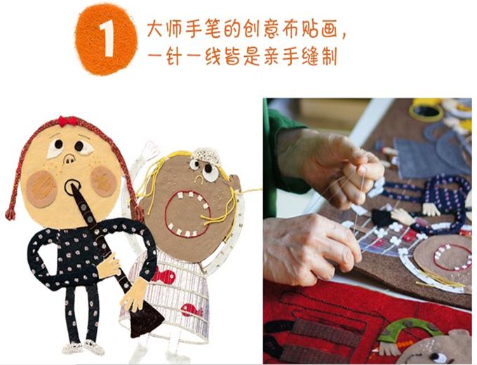 玛尼卡曾说过:“我的创作灵感来源于家庭。”作为三个孩子的母亲,她将对孩子的爱倾注在了作品里,每次读她的作品就会让人想起游子吟中“临行密密缝”的意境,她为孩子付诸的心思非常打动人。 玛尼卡的创作与普通的绘本不太一样,全是由手工的拼贴、钩织、缝绣等工艺组合而来的。建筑师出身的她推翻了常规的绘画习惯,用布和线代替颜料和画笔,运用各种不同织布材料,构筑了一个个憨态可掬、活灵活现,充满童趣的角色。她精心勾勒每一个动态细节,使得每个角色都栩栩如生,哪怕是同一种动物,也会根据情景,利用完全不同的缝制方法和材料来表达。这些角色就仿佛被倾注了生命,不仅外型,脾气性格让在画面外的读者也能够看到、感受到。而丰富的素材的选用和组合,相信一定能够对孩子的艺术思维和创造力有很大的启发。 与我们常见的绘本平铺直叙、娓娓道来的讲故事方式不同,玛尼卡喜欢把整个故事像舞台剧一样展现在读者面前,有直观的矛盾冲突、也有温暖的亲情流动;角色之间的情感交流更丰富也更直接,每一次阅读都是一次情感的体会和感受。情感的传递,感知别人的感受,这将非常有利于帮助孩子进行情绪上的自我管理。另外,这几乎是一本剧本(甚至还画好了分镜头!),孩子们可以拿着绘本,选好角色,直接演绎。 现在的图书市场,充斥着各种各样为了缓解家长焦虑而创作出来的绘本,而玛尼卡却主张从孩子的角度来创作。她想让孩子在充满爱的氛围中阅读,借助她作品特有的形式——特别的插画形式,特别的讲述方式,以孩子*接受的方式,帮助他们度过那些烦恼的时刻。