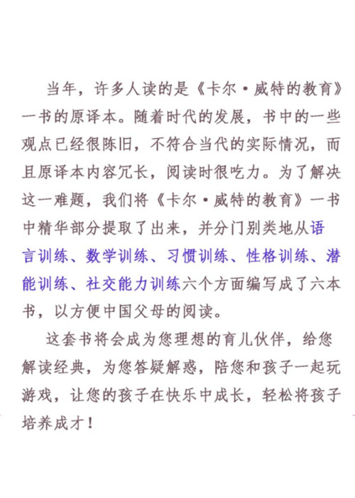 《卡尔·威特经典教育》丛书系列不仅深入浅出的解读了《卡尔·威特的教育》一书作者的思想,使中国的父母更加容易理解和领悟,而且,《卡尔·威特经典教育:语言训练》还根据孩子的生长发育和心理发展特点,在每一节里都精心设计了针对性、趣味性很强的小游戏,使本书的操作性更强。这套书将会成为家长理想的育儿伙伴,给家长解读经典,答疑解惑,让孩子在快乐中成长,让家长轻松将孩子培养成才!