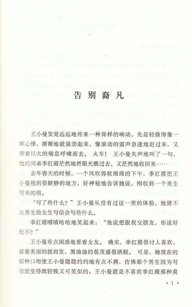 告别裔凡 王小曼发觉远远地传来一种异样的响动,先是轻微得像一阵心悸,渐渐地就强劲起来,像滚动的雷声急速地赶过来,又带着巨大的喘息呼啸而去。火车!王小曼失声地叫了一句,她的同桌季红霞茫然地将眼光瞧过去,又茫然地收回来…… 去年春天的时候,一个风吹得软绵绵的下午,季红霞把王小曼拖到很僻静的地方,好神秘地告诉她说,刚收到一个男生写来的信。