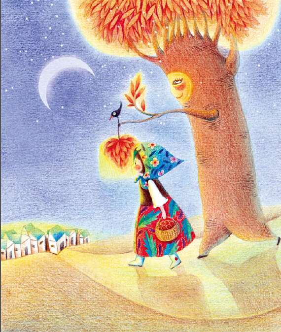 在茫 茫的夜色里,只见一棵满树亮着红叶灯笼的小树和一个小姑娘 手拉手走向 远方。