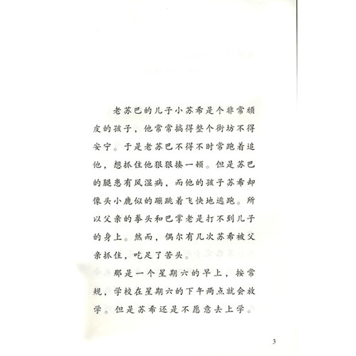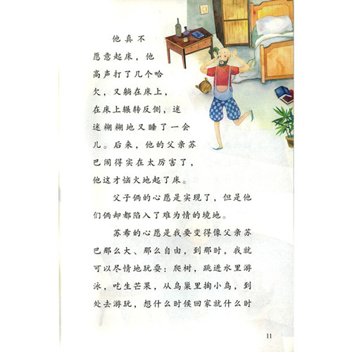 该故事讲的是老苏巴望子成龙心切,总是把希望寄托在儿子身上。而儿子苏希希望自己长大了可以为所欲为,像父亲一样管制别人。但当愿望之神满足了他们的心愿后,互换角色的父子俩都觉得没有原来快乐。请求愿望仙子让他们还是回到原来的生活,他们才得到了各自的快乐。这篇童话给我们带来一些关于父母与子女如何很好相处的启示,也告诉人们要珍现在拥有的一切,尽自己的最大努力做好每一件事,不能光看别人好的一面,而忽略自己眼前应该珍惜的人或事。