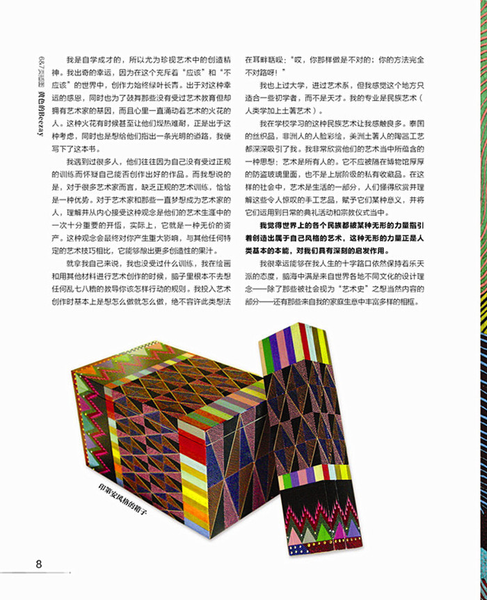 章 艺术课堂可能是一个危险的地方 我是自学成才的,所以尤为珍视艺术中的创造精神。我出奇的幸运,因为在这个充斥着“应该”和“不应该”的世界中,创作力始终绿叶长青。出于对这种幸运的感恩,同时也为了鼓舞那些没有受过艺术教育但却拥有艺术家的基因,而且心里一直涌动着艺术的火花的人。这种火花有时候甚至让他们燥热难耐,正是出于这种考虑,同时也是想给他们指出一条光明的道路,我便写下了这本书。 我遇到过很多人,他们往往因为自己没有受过正规的训练而怀疑自己能否创作出好的作品。而我想说的是,对于很多艺术家而言,缺乏正规的艺术训练,恰恰是一种优势。对于艺术家和那些一直梦想成为艺术家的人,理解并从内心接受这种观念是他们的艺术生涯中的一次十分重要的开悟,实际上,它就是一种无价的资产。这种观念会终对你产生重大影响,与其他任何特定的艺术技巧相比,它能够酿出更多创造性的果汁。 就拿我自己来说,我也没受过什么训练,我在绘画和用其他材料进行艺术创作的时候,脑子里根本不去想任何乱七八糟的教导你该怎样行动的规则。我投入艺术创作时基本上是想怎么做就怎么做,绝不容许此类想法在耳畔聒噪:“哎,你那样做是不对的;你的方法完全 不对路呀!” 我也上过大学,进过艺术系,但我感觉这个地方只适合一些初学者,而不是天才。我的专业是民族艺术(人类学加上土著艺术)。 我在学校学习的这种民族艺术让我感触良多。泰国的丝织品,非洲人的人脸彩绘,美洲土著人的陶器工艺都深深吸引了我。我非常欣赏他们的艺术当中所蕴含的一种思想:艺术是所有人的。它不应被隔在博物馆厚厚的防盗玻璃里面,也不是上层阶级的私有收藏品。在这样的社会中,艺术是生活的一部分,人们懂得欣赏并理解这些令人惊叹的手工艺品,赋予它们某种意义,并将它们运用到日常的典礼活动和宗教仪式当中。 我觉得世界上的各个民族都被某种无形的力量指引着创造出属于自己风格的艺术,这种无形的力量正是人类基本的本能,对我们具有深刻的启发作用。 我很幸运能够在我人生的十字路口依然保持着乐天派的态度,脑海中满是来自世界各地不同文化的设计理念—除了那些被社会视为“艺术史”之想当然内容的部分—还有那些来自我的家庭生意中丰富多样的相框。