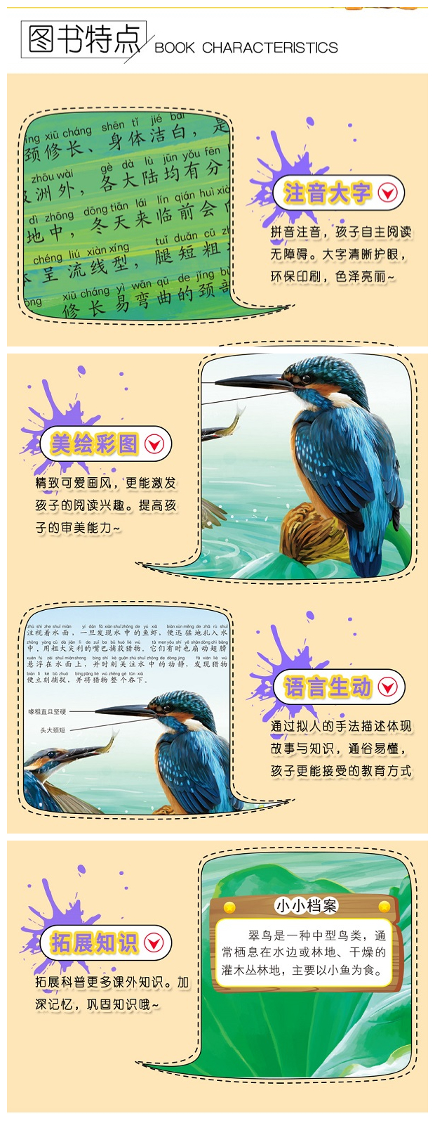 本系列是儿童编写的动物百科知识介绍,分门别类,配有精美手绘插图,集知识性、科学性、趣味性于一体,是儿童了解动物科普知识的好帮手。本册甄选了鸟类中具有代表性的优雅的空中翱翔者,通过大量手绘图稿和详尽的文字介绍了这些鸟类的外形、特点以及生活环境,满足孩子们的好奇和求知。