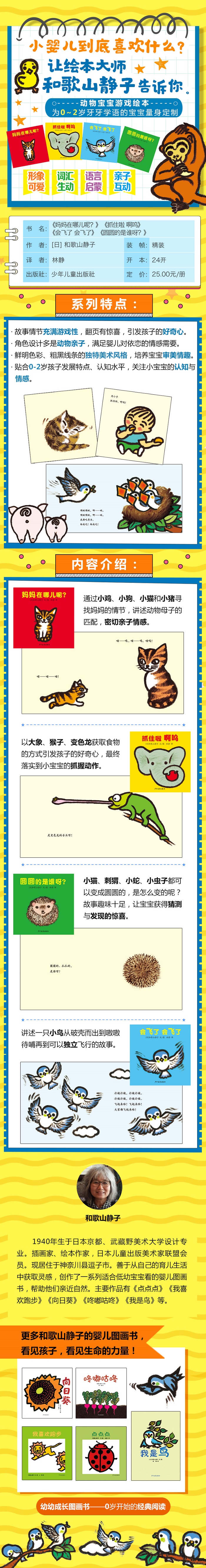 本书以可爱的形象、贴合0-2岁孩子发展特点、认知水平的情节设置来结构故事,向小宝宝介绍了四种”圆圆的”的动物,包括:圆圆的、毛茸茸的小猫,圆圆的、滑溜溜的蛇,圆圆的、扎扎的刺猬,还有圆圆的、骨碌骨碌爬的西瓜虫。通过不断反复的句式结构、朗朗上口又富有表现力的语言,推动情节的悬念设置,让小动物们的完整样貌逐渐显现,并把它们的主要特征表现了出来。