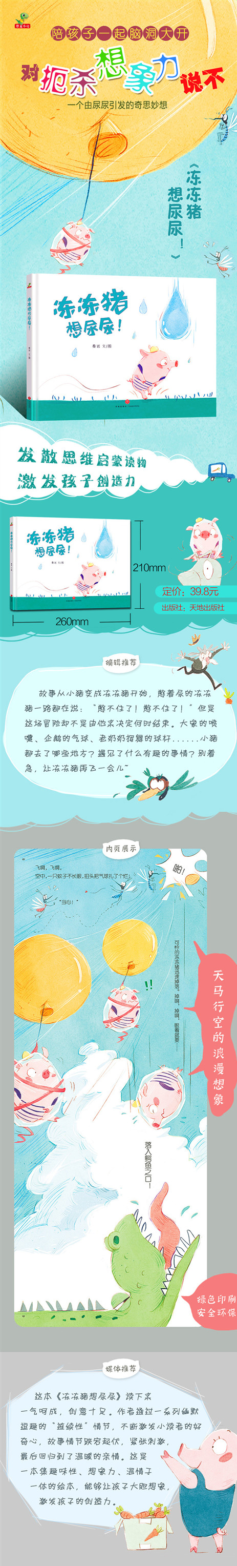 本书为原创绘本,是适合3岁以上儿童的绘本。本书讲述了一只想尿尿的小猪,在跑回家的途中被从天而降的大雨滴“冻住”后所经历的各种滑稽的遭遇,他被大象的喷嚏喷到了南极,被氢气球带上了天,闯入云彩里,被小女孩的风筝线缠住,被球杆打进胡萝卜田,最后跟着胡萝卜回到了猪妈妈温暖怀抱的故事。故事读下来一气呵成,通过小猪一系列幽默逗趣的“连续性”遭遇,不断激发小读者的好奇心,情节起伏跌宕,生动有趣,而又温暖动人,是一本集趣味性、想象力、温情于一体的儿童绘本。既适合孩子独立阅读,也适合亲子阅读。